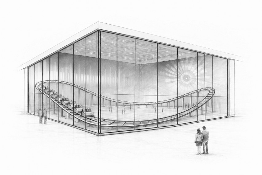 Based on these premises, I have developed a spatial installation in which movement organizes perception. The roller coaster functions as a central structuring element within a larger constellation of space, sound, light, and human presence. It describes a continuous line through space that orders rhythm and time. This dynamic is not understood as an event, but as a state. Space becomes perceptible as a temporal configuration.