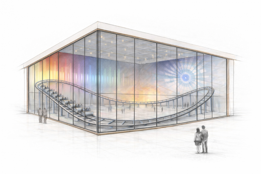 Gemäß den Anforderungen der Ausschreibung der EXPO 2027 ist Architektur integraler Bestandteil des Konzepts und dient der räumlichen Organisation von Erfahrung, Teilhabe und Öffentlichkeit. Sie fungiert als strukturierende Hülle der Installation, organisiert Besucherführung und Offenheit und stellt die bewusste Verbindung von Innen- und Außenraum her, ohne als autonomes Objekt in den Vordergrund zu treten. Die Glaswände öffnen die Installation nach außen. Die visuellen Abläufe im Inneren werden Teil des öffentlichen Raums. Licht, Farbe und Bewegung treten in Beziehung zur Umgebung und machen den gesamten Prozess sichtbar. Wahrnehmung wird geteilt.