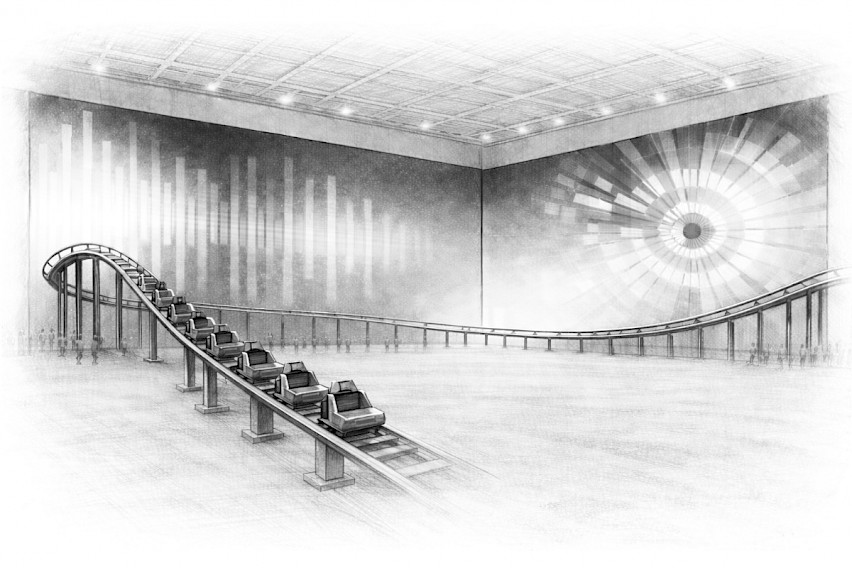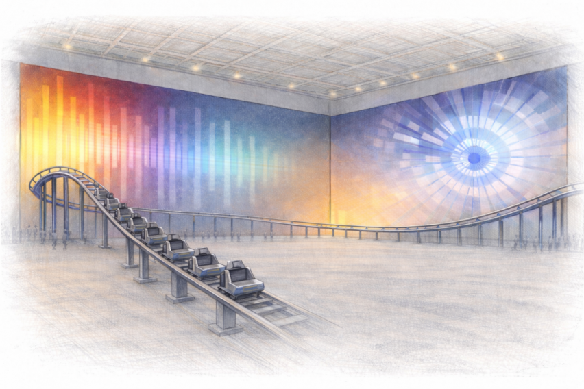 Ausgehend von diesen Vorgaben habe ich eine raumgreifende Installation entwickelt, in der Bewegung die Wahrnehmung organisiert. Der Roller Coaster bildet dabei ein zentrales, strukturierendes Element innerhalb eines größeren Gefüges aus Raum, Klang, Licht und menschlicher Präsenz. Er beschreibt eine kontinuierliche Linie im Raum, die Rhythmus und Zeit ordnet. Diese Dynamik wird nicht als Ereignis verstanden, sondern als Zustand. Der Raum wird als zeitliches Gefüge erfahrbar. Die Installation verbindet körperliche Erfahrung, Klang und visuelle Übersetzung zu einem zusammenhängenden System. Rhythmus erzeugt Klang, Klang wird in Echtzeit in Farbe, Form und Licht übersetzt. Zwei großformatige LED-Walls fungieren als visuelle Oberfläche dieses Prozesses. Sound, Bild und räumliche Dynamik stehen in direktem Zusammenhang und verändern sich fortlaufend.